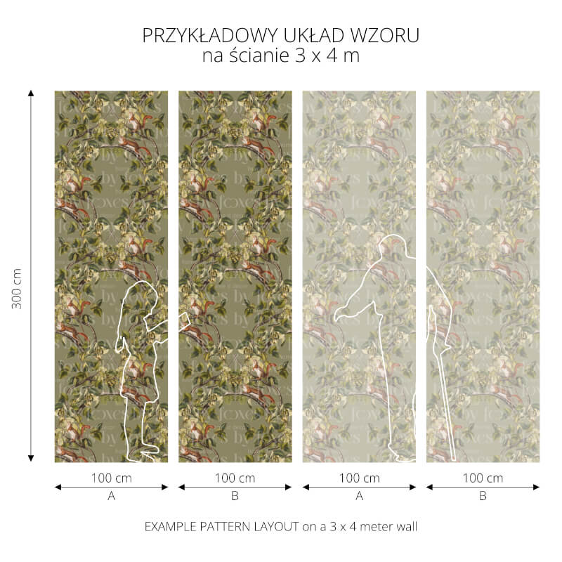 Jeśli potrzebujesz tapetować ścianę z otworami okiennymi, drzwiowymi lub innymi; ścianę ze skosami, wnękami itp. albo sąsiadujące ze sobą ściany skontaktuj się z BY FOXES → w celu ustalenia łączenia wzorów na poszczególnych ścianach.