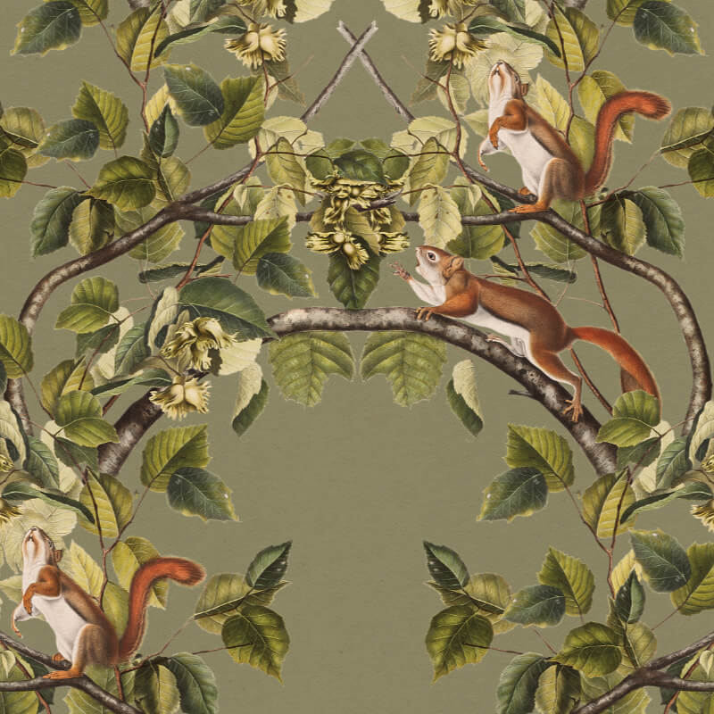 Z czym połączyć oliwkową tapetę ścienną Leszczynowe Wiewiórki?