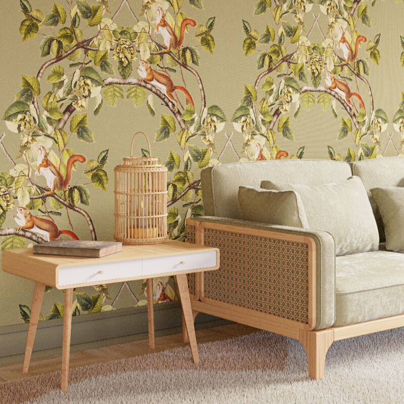 Do jakiego stylu wnętrza pasuje oliwkowa tapeta ścienna Leszczynowe Wiewiórki?
