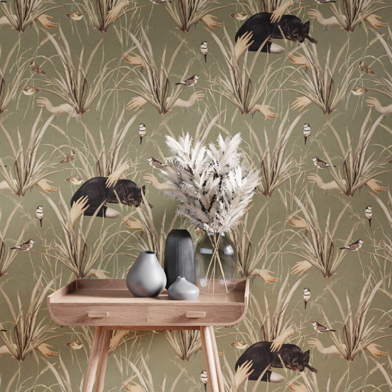 Zgaszona zielona tapeta w lisy, dłonie, ptaki i suche trawy dobrze komponuje się z drewnianymi meblami, jasnymi, ciepłymi lub wręcz przeciwnie! Czarnymi tkaninami oraz dodatkami z naturalnych materiałów takich jak ratan, ceramika, kamień.